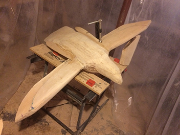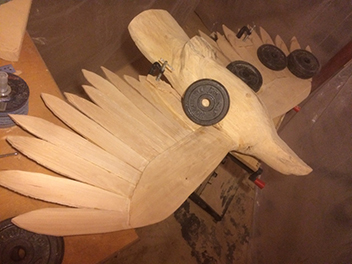 After cutting individual feathers from finely milled basswood, it's time to glue and clamp them to the top.